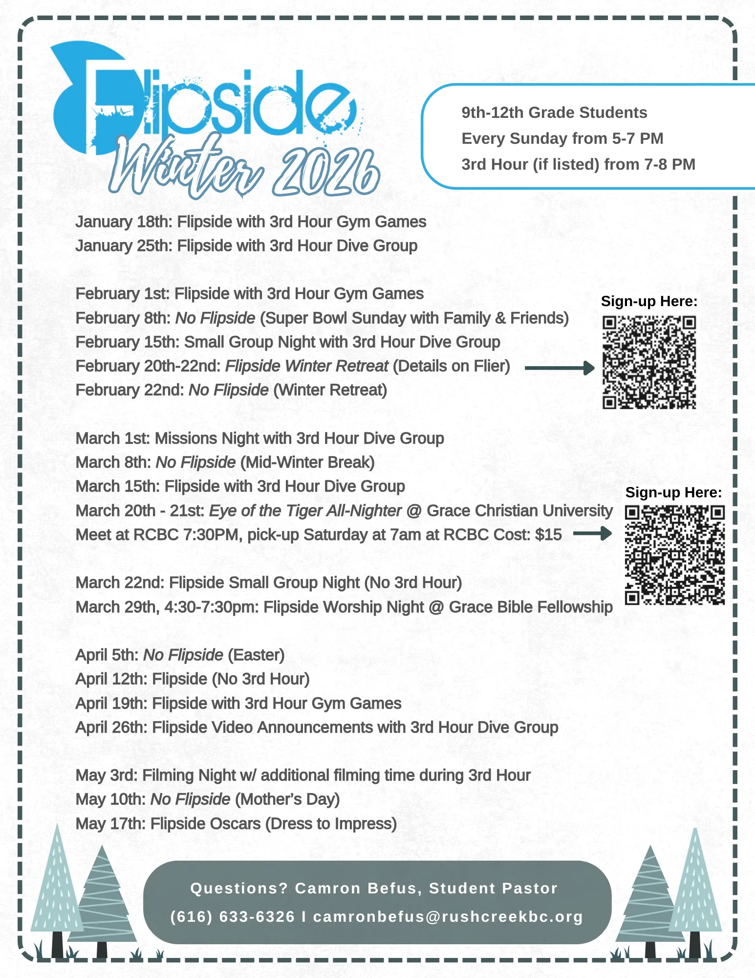 If you have any questions about Flipside, please contact Camron Befus, our Student Pastor.