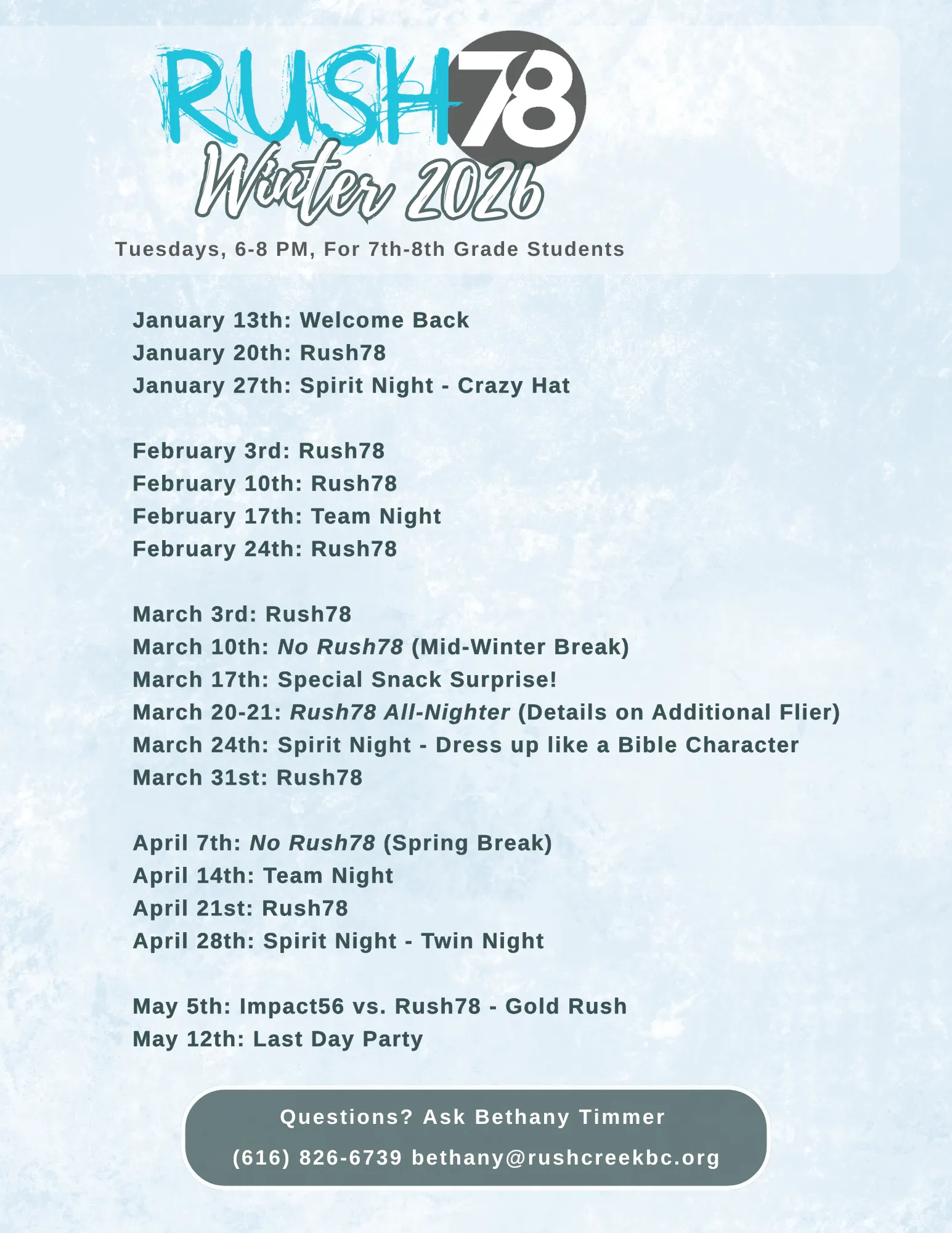 During the school year, Impact56 and Rush78 meet on Tuesdays from 6-8PM. Students will worship, receive a Bible lesson, participate in a small group discussion time, and play games. We have a strong group of leaders who are excited to invest in your student and get to know them on a deeper level.